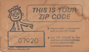 This Post Office postcard encouraging the use of the 07920 (Basking Ridge) ZIP code is a recent addition to the Historical Society’s archives at the Brick Academy. A gift from Barbara Perkins, the card features “Mr. ZIP” and was found in a house on North Alward Avenue.