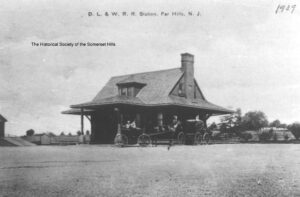 This 1909 real picture postcard shows the original Far Hills, NJ, Train Station with the freight house on the left. The station was built in the 1890s when the railroad was extended from Bernardsville to Gladstone. The current concrete Far Hills station replaced it in 1914, but the original was moved. Most railroad stations can’t run far so we were able to track this one down easily. The old station was purchased in 1914 by local contractor William B. Flomerfelt (1859-1922) and now stands at 7 Spring St. where it is a private residence.