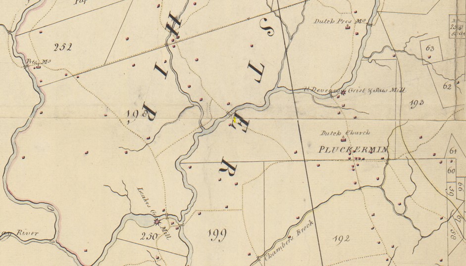 The southern section of Bedminster shows the mill of Andrew Leake, which after an unfortunate fire would become Burnt Mills (see THSSH Newsletter, Feb. 2023, p. 4). Pluckermin (Pluckemin) appears as the township’s principal settlement with a Dutch church. This was actually St. Paul’s Lutheran church which occupied the site of the current Pluckemin Presbyterian Church. The Bedminster Reformed Church at the site of the present Reformed cemetery is shown further north.