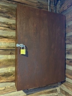 Before getting started inside, the Peapack-Gladstone Department of Public Works (DPW) and Recreation Department removed items stored in the cabin. Once completed, the interior work included: removing trash and debris throughout the cabin; sanding, scraping, and repainting the inside of the window sashes and frames; washing the windows; and giving each room and loft a thorough cleaning from top to bottom including the wooden beams, walls and floors. An iron wagon wheel chandelier in the main room was taken down, stripped of its paint, and refurbished with new paint, wiring and lights. A new, secured box was built around the electrical panel. A display case was cleaned and filled with the Troop 57 memorabilia that was found in the cabin, including the troop flag and various awards.
