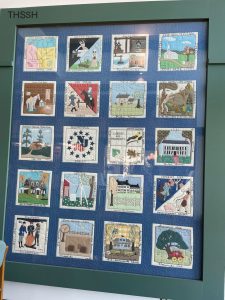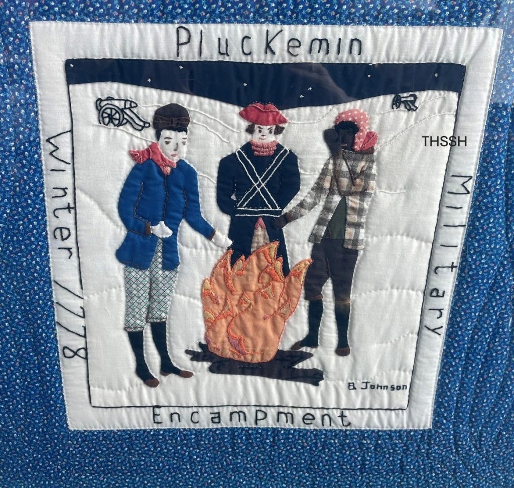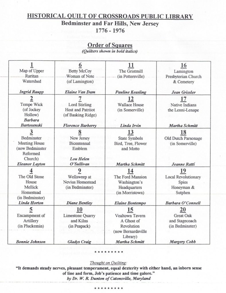 The quilt is made up of 20 individually designed squares and measures 81 x 100 inches. Eighteen women, mostly housewives and mothers from the Somerset Hills area made the quilt as a fund-raising project for what was then the Crossroads Public Library. Each square of 15 x 15 inches has an author who clearly loved our history. Each square depicts an important scene or person in our area during the Revolutionary War. The Crossroads Public Library was renamed the Clarence Dillon Public Library in 1979 after the Clarence and Anne Dillon Dunwalke Trust paid off the library’s mortgage.