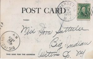 The card is addressed to Miss Dora Satterlee, Big Indian, Ulster Co., NY. Big Indian was and is a small hamlet in the Town of Shandaken in the Catskill region. Dora Satterlee (1881-1966) was easily located there on the 1905 NY State Census. She went on to marry (c.1905) William Lundergun.