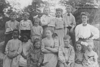 An early photo (c.1906) of the teacher and class from Burnt Mills School in Bedminster Township, NJ. The photographer was Peapack-Gladstone resident, Edythe Lane Van Doren (1885-1974). Burnt Mills school was a one-story school in the hamlet of Burnt Mills near the intersection of Burnt Mills and Cowperthwaite roads. On a map of Somerset County