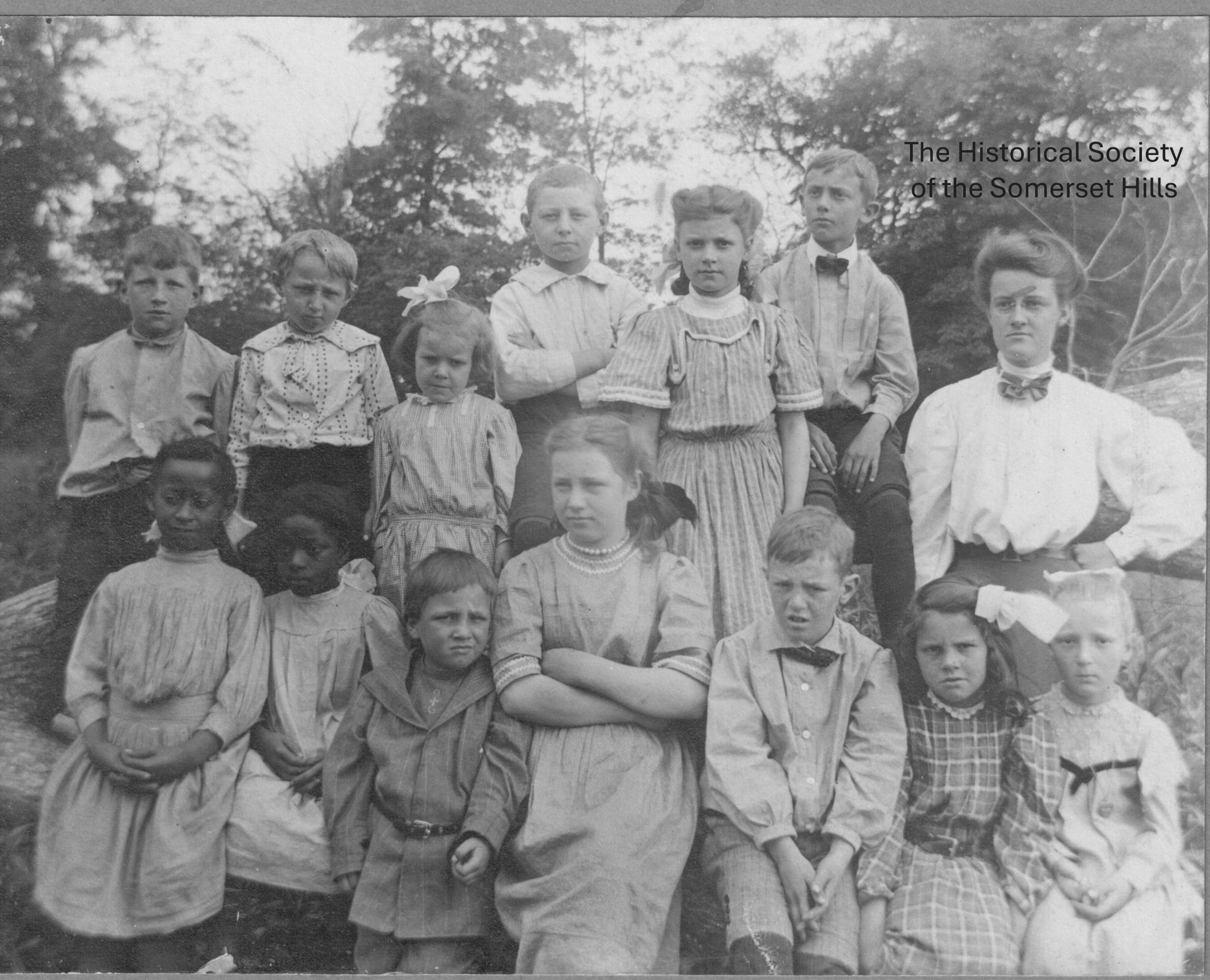 An early photo (c.1906) of the teacher and class from Burnt Mills School in Bedminster Township, NJ. The photographer was Peapack-Gladstone resident, Edythe Lane Van Doren (1885-1974). Burnt Mills school was a one-story school in the hamlet of Burnt Mills near the intersection of Burnt Mills and Cowperthwaite roads. On a map of Somerset County