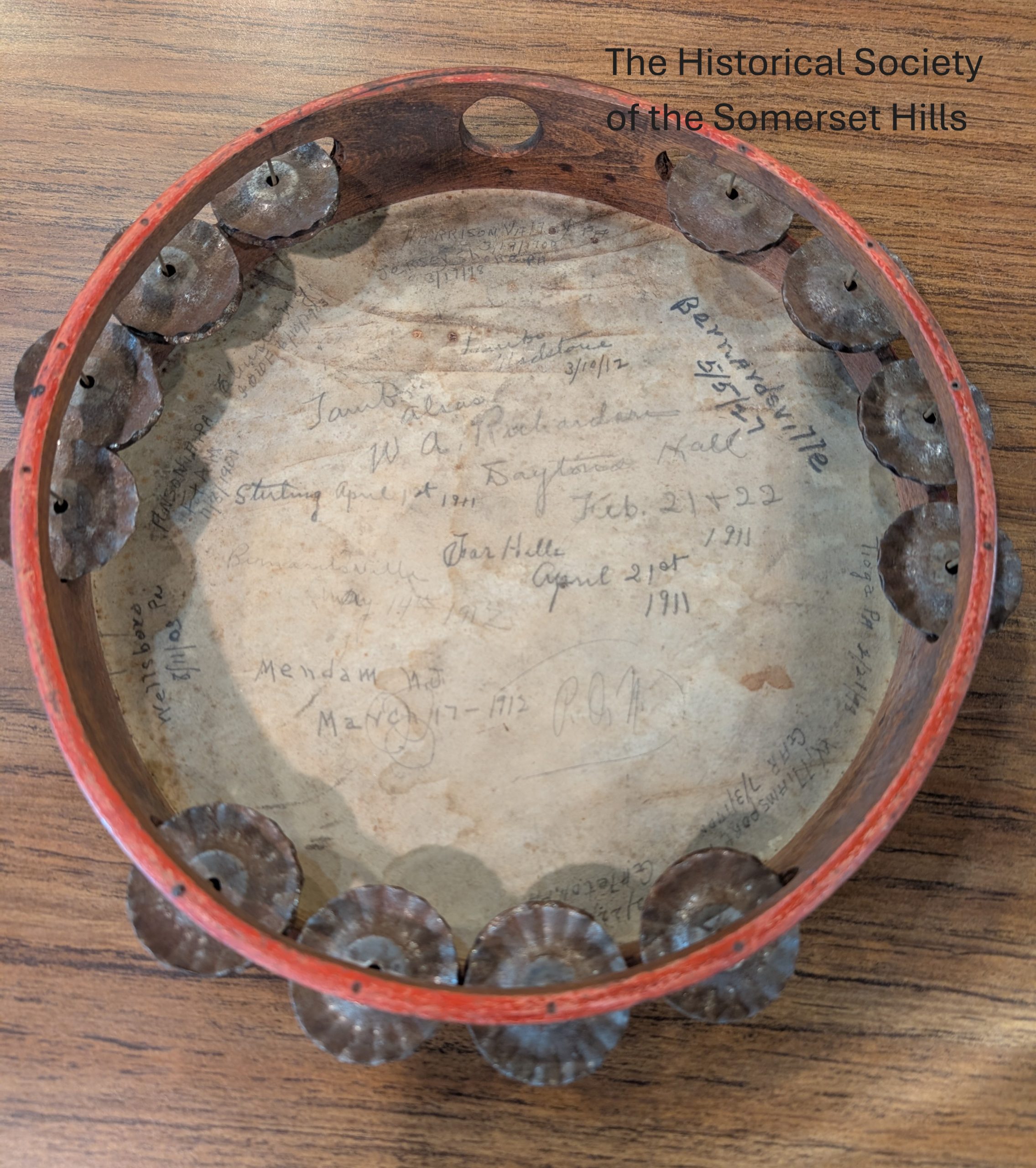 From the dates written on the bottom, the tambourine was used in parades beginning in Pennsylvania and New York in the 1890s. An inscription for Dayton’s Hall, Feb. 21 and 22, 1911 shows that Richardson was present at a fire department fundraiser held there that year. Dayton’s Hall stood on North Finley Avenue where the current Presbyterian Church parking lot is. The last inscription was for an event in Bernardsville in 1927.