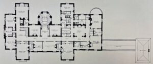 The mansion is laid out in something of a modified “H” pattern. The narrower main entrance façade with its imposing carved limestone and pedimented front is at the easterly end of the forecourt with its 300-foot-long reflecting pool. The long forecourt axis is continued inside the mansion by a wide, Caen limestone-walled hallway, or gallery space, featuring two massive fireplaces and extending straight through the house from the front door to the dining room at the far end.