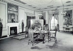 Located at the far end of the main cross hall from the front entrance was the formal dining room, and off that to the north a conservatory-like breakfast room. Sometime around 1917 these spaces were altered to eliminate the breakfast room and turn the dining room ninety degrees from an east-west to a north-south axis. Redone in the Neoclassical English style of Robert Adam, the new dining room featured bow-fronted French doors leading out to the walled garden.