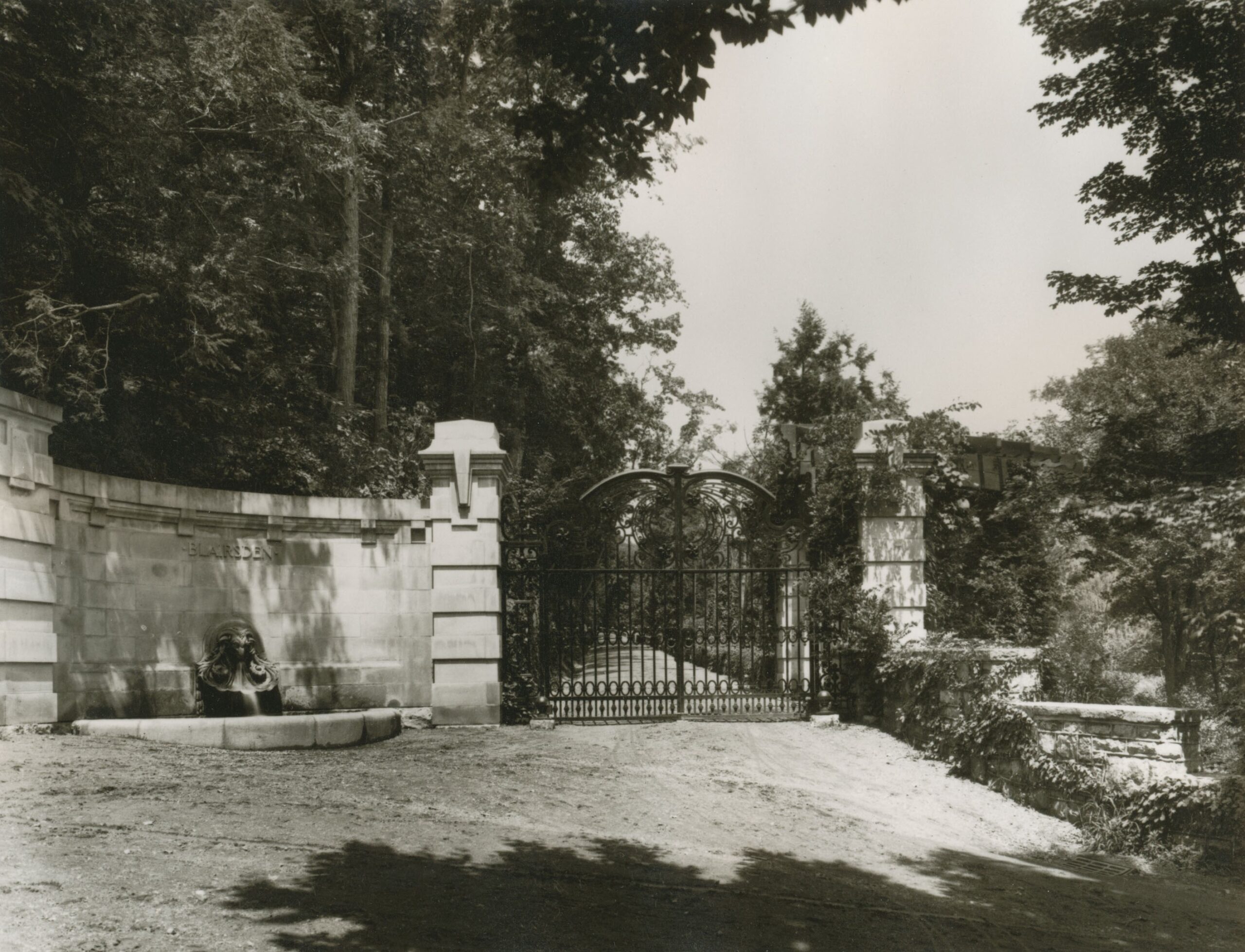 The original main entrance drive, which is no longer accessible, began at the Ram’s Gate located off Lake Road across a rustic stone arch bridge over the North Branch of the Raritan River a short distance below the Ravine Lake dam. The entrance got its name from the carved ram’s head fountain that projected from a curved limestone retaining wall adjacent to a set of high iron gates. On the wall above the fountain the name “Blairsden” was embossed in block capital letters.