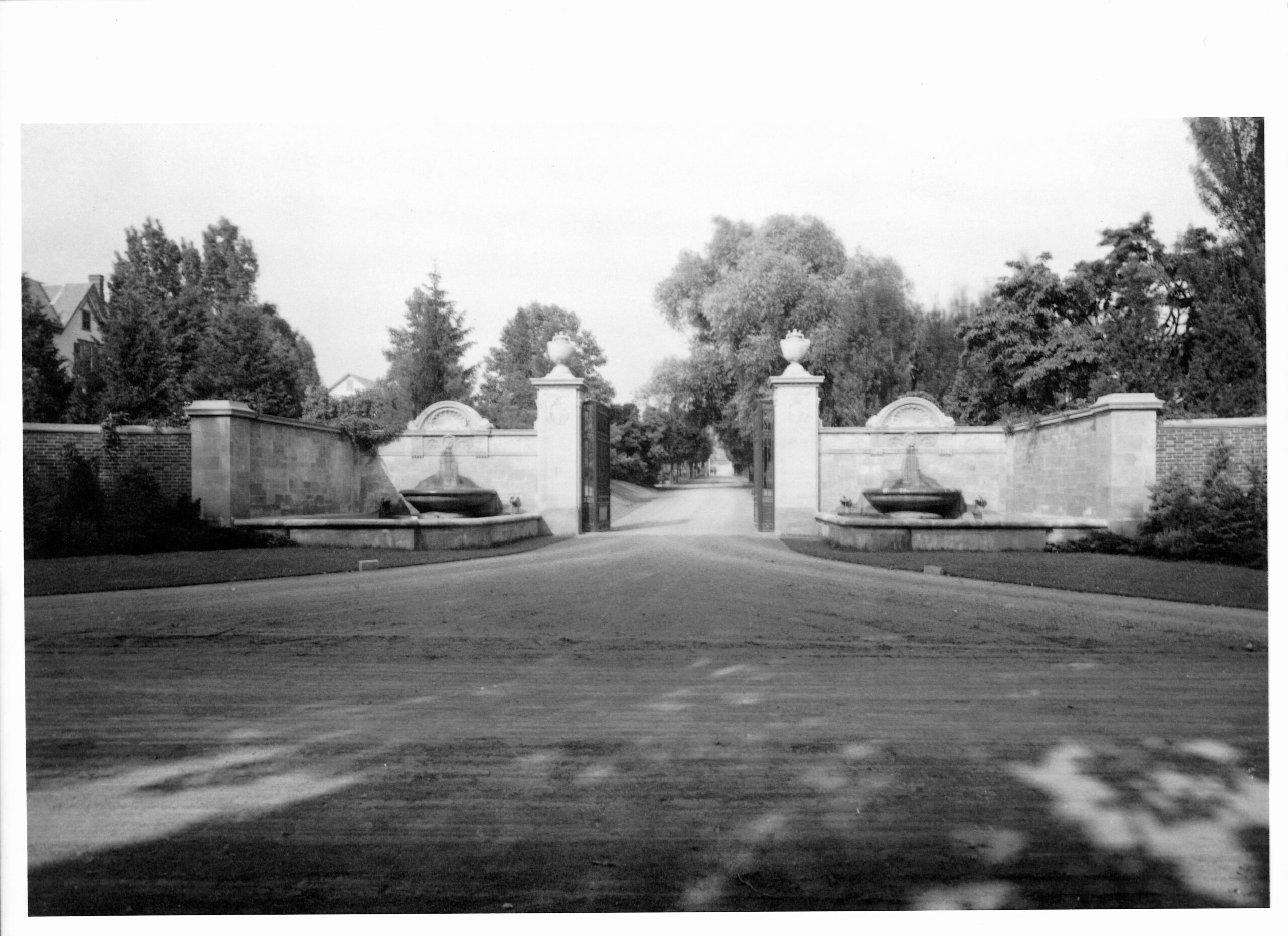 Between the set of columns on the left side of the drive, opposite the loggia, was a low arched brick and stone wall with a watering trough for horses that was fed by a carved, water-spouting mythological sea creature. On either side of the watering trough were balustrades behind which was a semicircular pool from which water flowed to fill the series of pools and basins leading down toward Main Street.
