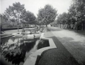 Water originally flowed over the edges of the basins into the underlying pools, then flowed downhill from one pool to the next. To soften the hardscape of the pools and basins, and to provide shade and draw the eye further up the drive, a double allée of regularly spaced trees was planted along both sides of the pools, with a parallel row of trees planted along the opposite side of the drive for symmetry. To visually enclose the scene, a hedge of neatly trimmed privet was planted a short distance behind the pools and basins, and on the opposite side of the drive, behind the row of trees, a decorative lattice fence, painted a near-black Essex green, was set between limestone-topped brick pillars to provide a border and backdrop.