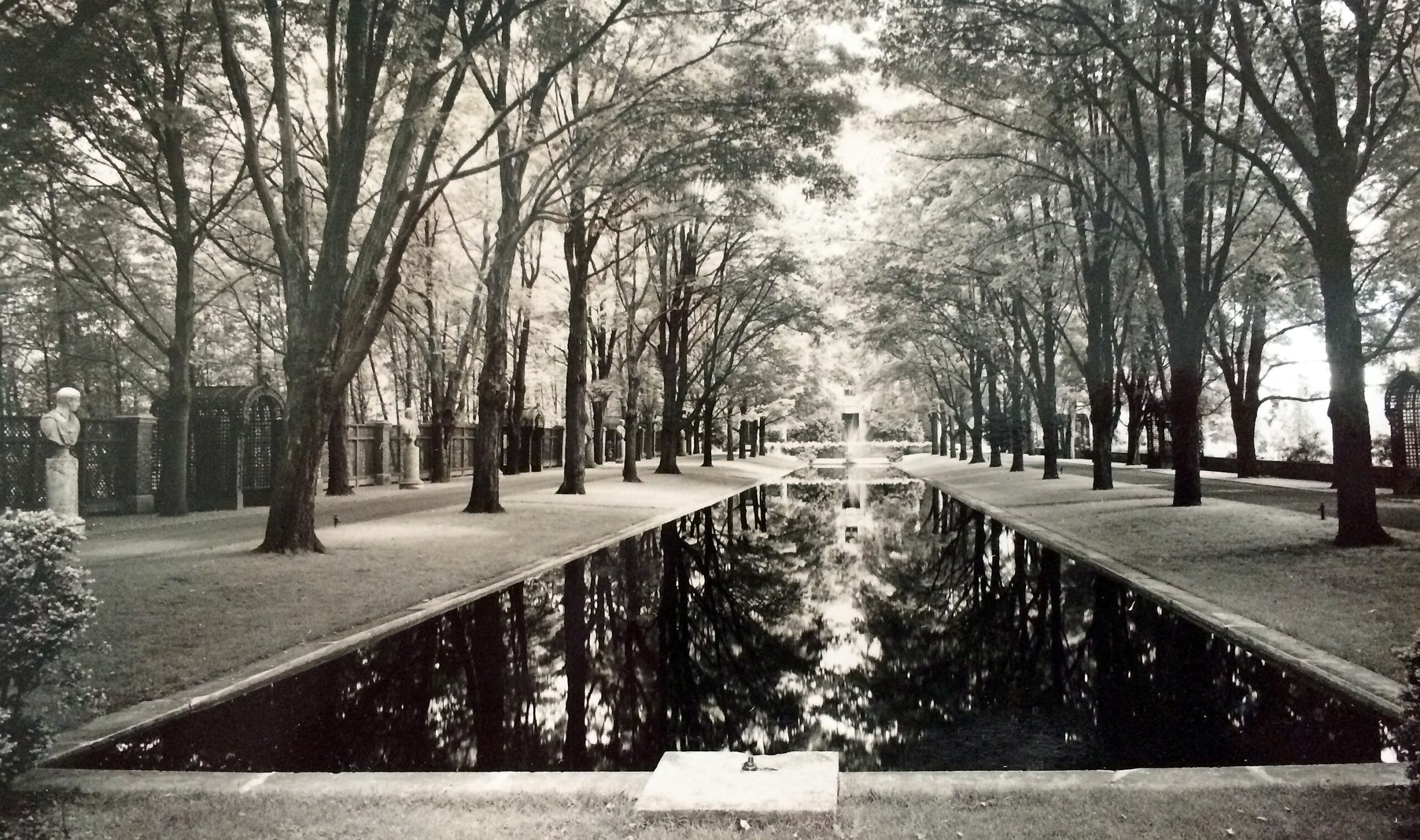 Completing the landscape scheme around the reflecting pool, large boxwoods were planted at intervals under the maple trees and glazed terra cotta olive oil jars were placed along the pool’s coping. Marble busts of Roman emperors on stone pedestals were placed in front of dark-green-painted lattice fencing along one side; and at both ends of the reflecting pool antique carved Italian wellheads were fitted to spout water into the pool on which swans lazily swam.