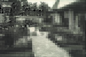 After making the turn, the drive continued upward in a straight line, crossing the hill and the cedar-tree allée at the midpoint and offering a closer view of the mansion still high above. On the uphill side, the view was of a parallel series of brick and stone steps and landings descending from the mansion. Between the two rows of steps were low plantings that partially covered a water rill that flowed down into a pool at the side of the drive. The downhill side of the drive revealed the series of steps, landings, and mosaic ramps that had previously been viewed from below.