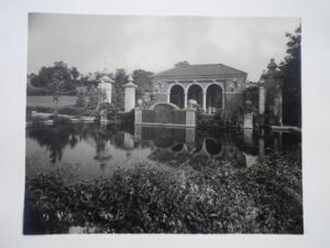 Near the tennis courts, the Blairs built a roofed brick and lattice garden pavilion, sometimes known as a tea house. Beyond the tea house, and parallel to the tennis courts, was a large rose garden, designed with long parallel planting beds separated by pools of water and fountains, and with latticed seating areas providing shelter and views overlooking the mansion and the hills and lake beyond.