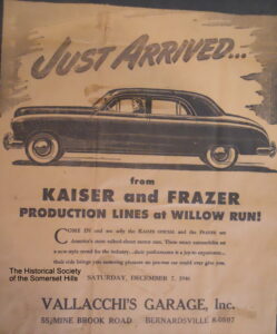 During the 1940s, Vallacchi’s Garage at 55 Mine Brook Road (Rte 202), Bernardsville, N.J., was the place to go for a new automobile. The Kaiser-Frazer Corporation, founded in 1945, was a successful company at a time when the big three automakers were slowly transitioning to a peacetime economy. In 1946, while the big three were still relying on pre-war designs, Kaiser-Frazer produced newly designed models at their Willow Run, Michigan, production facility. Willow Run was the government-owned building where Ford had produced B-24 bombers during World War II.