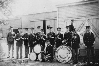 The Bernards Fife and Drum Corps, Bernardsville, NJ, was organized on July 16, 1906 and posed that year for this photo, possibly before a parade. The date is supported by a note on the reverse by Edwin S. Spinning, fire company president, who also identified the building on the right as Bernardsville’s first firehouse. The